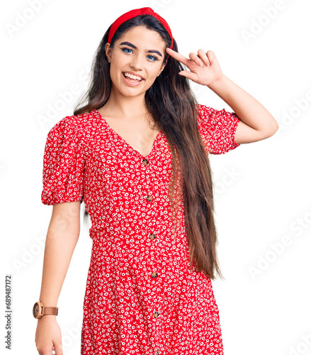 Brunette teenager girl wearing summer dress smiling pointing to head with one finger, great idea or thought, good memory