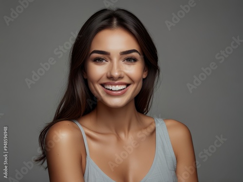 Brunette with radiant smile and beauty skin, grey background, dental and skincare concept