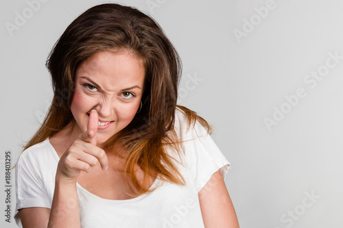 brunette with smile and emotion finger up