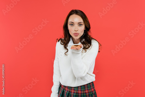 Brunette woman in jumper and plaid skirt blowing air kiss isolated on red