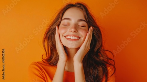 Brunette woman smiling from pleasure. Girl with closed eyes, touches her face and dreams about smth, thinking or imaging, standing over orange background