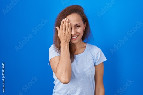 Brunette woman standing over blue background covering one eye with hand, confident smile on face and surprise emotion.