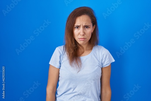 Brunette woman standing over blue background depressed and worry for distress, crying angry and afraid. sad expression.