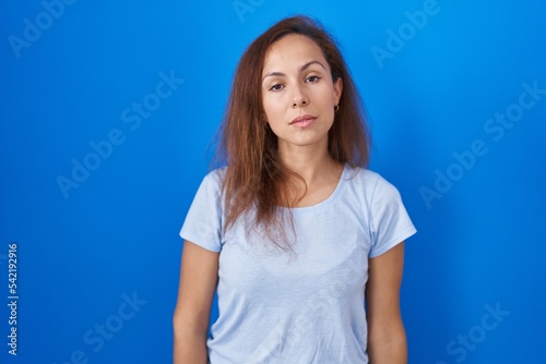 Brunette woman standing over blue background relaxed with serious expression on face. simple and natural looking at the camera.