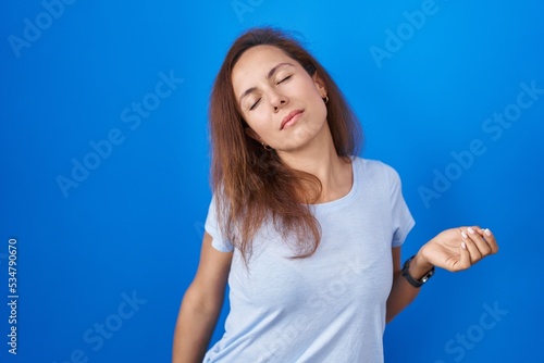 Brunette woman standing over blue background stretching back, tired and relaxed, sleepy and yawning for early morning