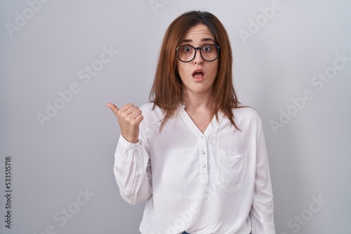 Brunette woman standing over white isolated background surprised pointing with hand finger to the side, open mouth amazed expression.