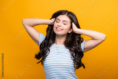 brunette woman with closed eyes toughing curly long hair and smiling isolated on yellow