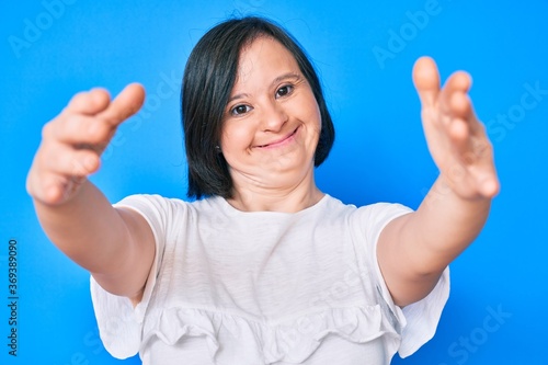 Brunette woman with down syndrome wearing casual clothes looking at the camera smiling with open arms for hug. cheerful expression embracing happiness.