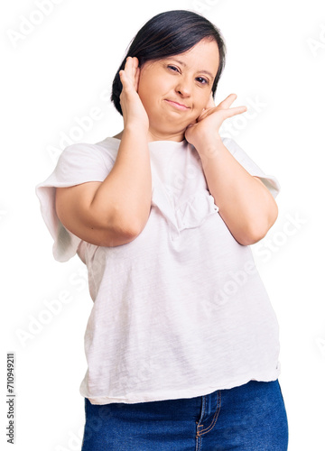 Brunette woman with down syndrome wearing casual white tshirt covering ears with fingers with annoyed expression for the noise of loud music. deaf concept.