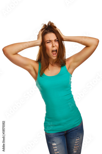 brunette woman yelling opened mouth her emotion studio in jeans