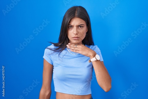 Brunette young woman standing over blue background cutting throat with hand as knife, threaten aggression with furious violence
