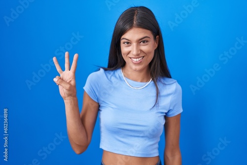 Brunette young woman standing over blue background showing and pointing up with fingers number three while smiling confident and happy.
