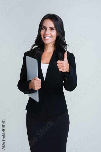 Business cutie. Beautiful young businesswoman holding her laptop and gesturing thumb up with smile while standing against white background