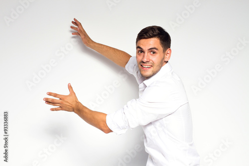 Business, education and office concept - businessman or teacher touching or moving on something from back on white background