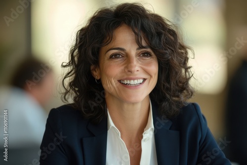 Business meeting professional woman confident smile dark curly hair white blouse