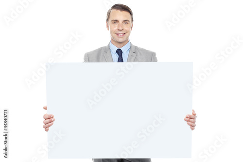Business representative holding white billboard