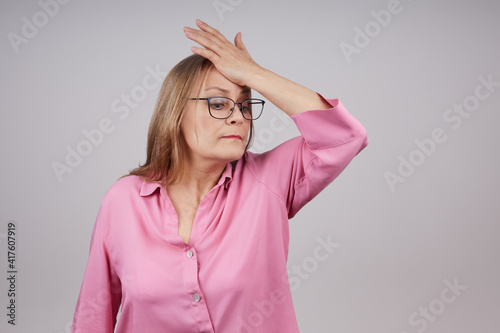 Business senior woman with glasses is having a headache. Studio photo on a gray background, with copy space