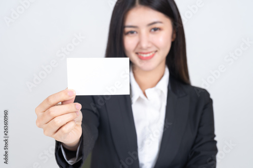business woman holding and showing empty business card or name card - business concept