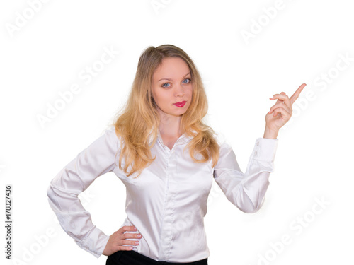 Business woman emotionally showing thumbs up. Isolated on a white background.