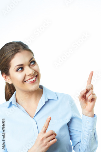 Business woman finger show. Presenting. Isolated white backgrou