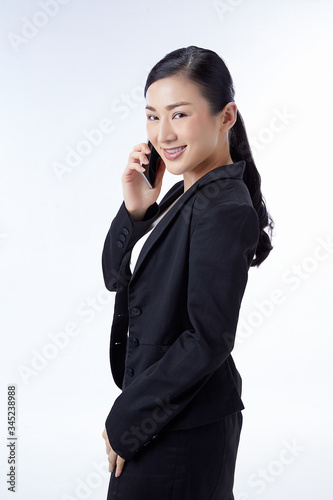 business woman in a black suit is happy and holding a phone Glad to succeed. Business Concept, Online, Internet