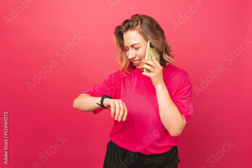 Business woman is talking to her phone while she is looking at watch near a pink wall