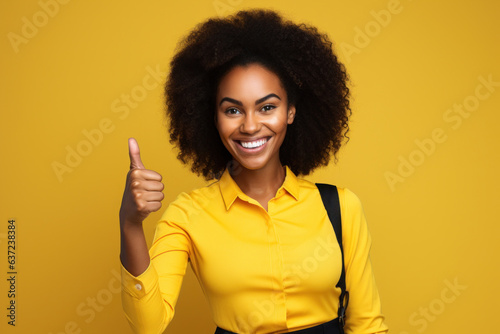 Business Woman Thumbs Up Looking at You Black Woman Yellow Background