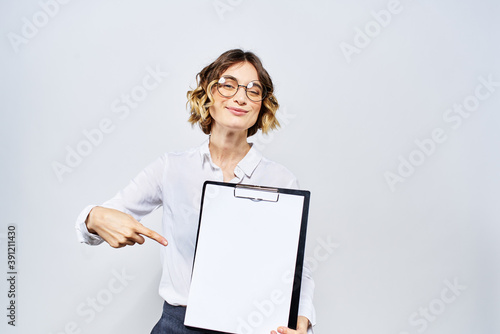 Business woman with a folder of white documents in her hand on a light background And hairstyle glasses model