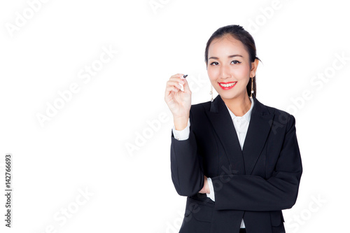 business woman writing on whiteboard with white copyspace