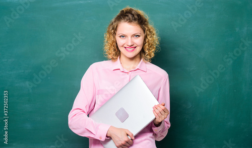 businesswoman at office. teacher woman at blackboard. modern technology. girl Study Online in Classroom. IT Lesson with Computer. e-learning concept. happy student with laptop. freelancer work