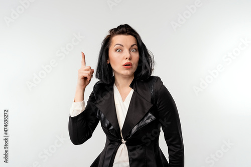 Businesswoman got idea. Career girl keeps finger up. Eureka gesture. Genius at work. Small business owners, women entrepreneurs concept