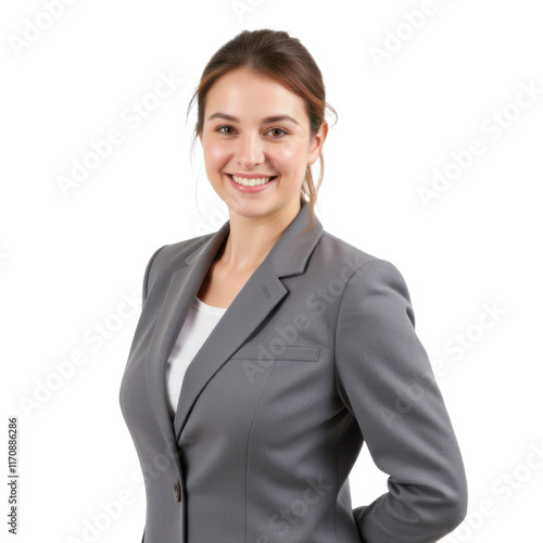 Businesswoman in a gray suit standing with a smile, isolated on a transparent background