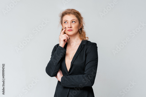 Businesswoman in suit looking considering on what she is going to do, standing over light grey background. Successful businesswoman leading business