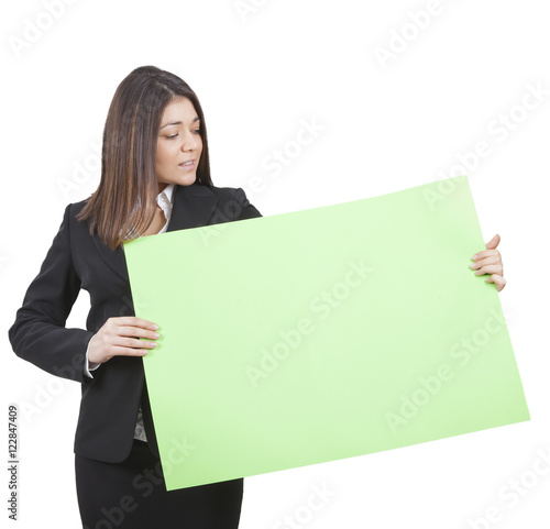 Businesswoman keeping signboard