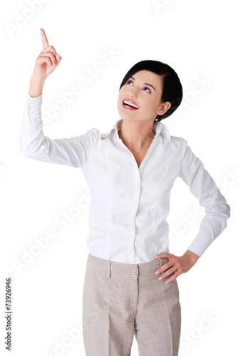 Businesswoman pointing up to the corner