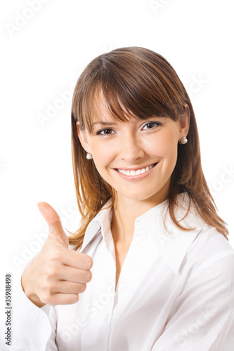 Businesswoman with thumbs up, on white
