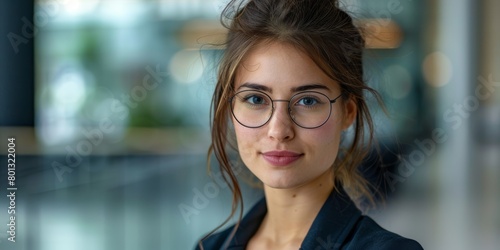 Businesswoman's serious face closeup. Hispanic office worker wearing glasses. Single, powerful female leader in work. A lovely woman's face