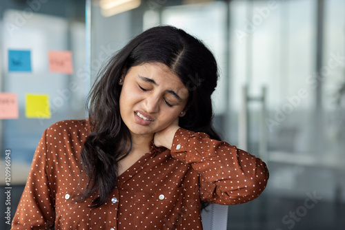 Busy and overworked woman working inside office. Businesswoman has severe neck pain, office worker close-up working late, preparing report.