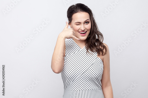 Call me. Portrait of funny beautiful young brunette woman with makeup and striped dress standing, winking and looking at camera with call gesture sign. indoor studio shot, isolated on grey background.