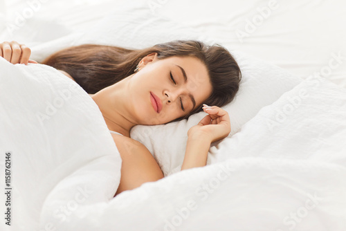Calm beautiful sleeping attractive young woman feeling comfortable, quiet, soothe, well in bed on soft white pillow, girl resting, good night sleep to enjoy fresh soft linen, new orthopedic mattress