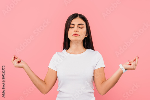 calm pretty brunette girl meditating with closed eyes isolated on pink