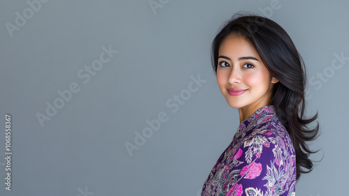 Canadian woman in traditional batik cloth isolated on gray copy space