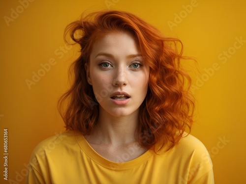 Candid photo capturing the humor and curiosity of a young redhead woman wearing a surprised and slightly confused expression, isolated against a vibrant yellow background.