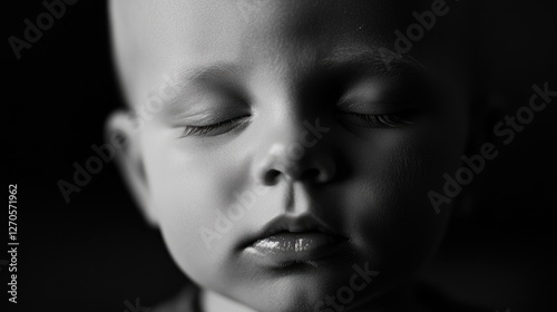 Candid portrait of a newborn sleeping with eyes closed, showcasing innocence and tranquility.