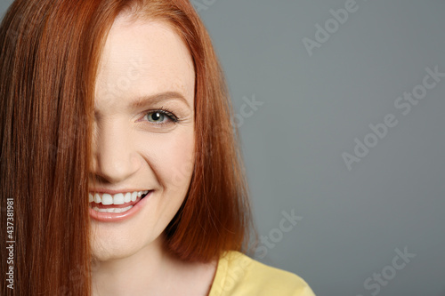 Candid portrait of happy young woman with charming smile and gorgeous red hair on grey background, closeup. Space for text