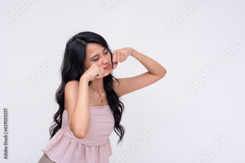 Candid scene of a young asian woman mocking someone making a sarcastic crying gesture. Isolated on a white background.