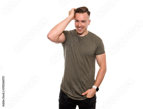 Candid shot of handsome young and fit man posing on isolated background