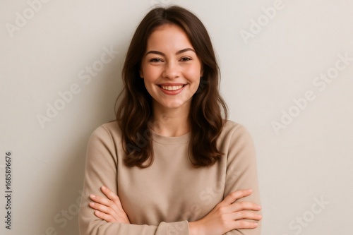 Capturing the essence of joy, a cheerful young woman with crossed arms radiates confidence and happiness against a clean white background