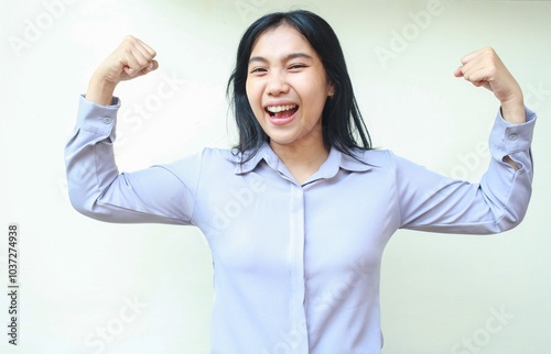 carefree powerful asian young business woman laughing at camera with raising arms showing muscle strength, proud of self achievement, wearing formal shirt standing over white background