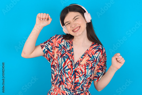 Carefree young caucasian woman wearing floral dress over blue background with toothy smile raises arms dances carefree moves with rhythm of music listens music from playlist via headphones